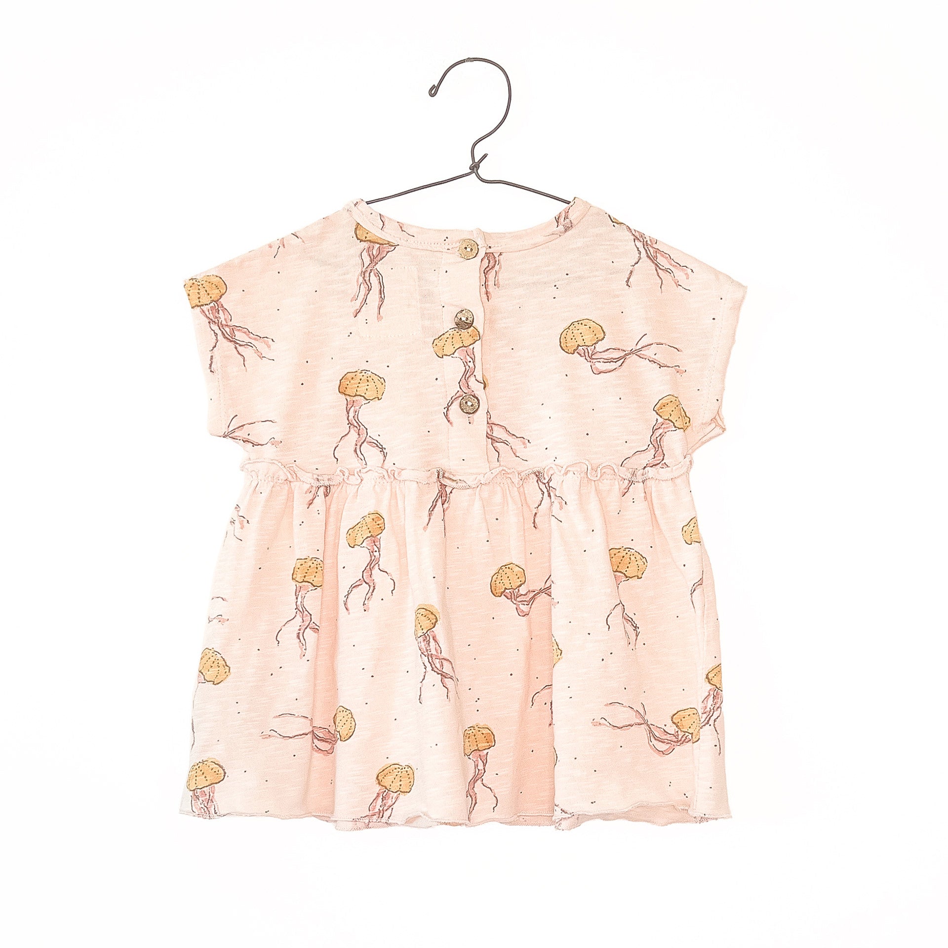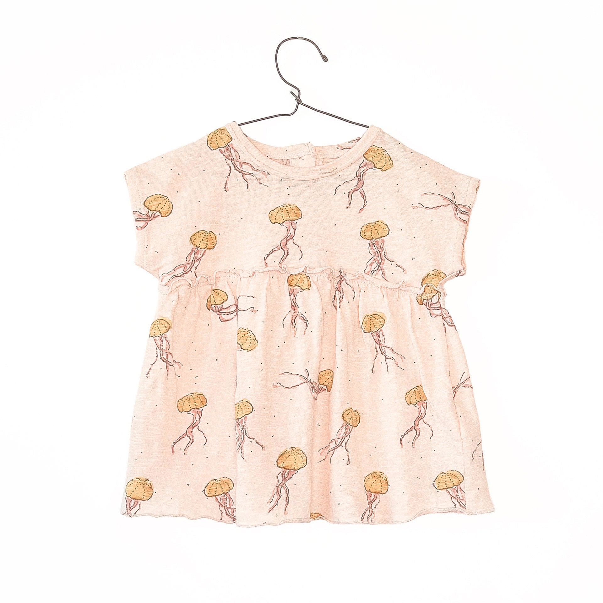 Deze jurk is gemaakt van jersey stitch biologisch katoen, Slow colour. Het model heeft een ronde hals en korte mouwen, er is een opening op de rug met kokosknopen, een franje op de borst en op de rug, en onze kwallenprint.