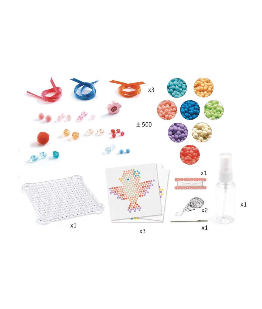 Inhoud: 1 werkplaat, 1 spuitfles, 1 set plastic kralen die met water blijven kleven (8 kleuren), kralen en bedeltjes, doorzichtig elastisch draad, satijnlint, 1 naald, 1 draaddoorhaler, 1 stap-voor-stap instructieboekje in kleur.
