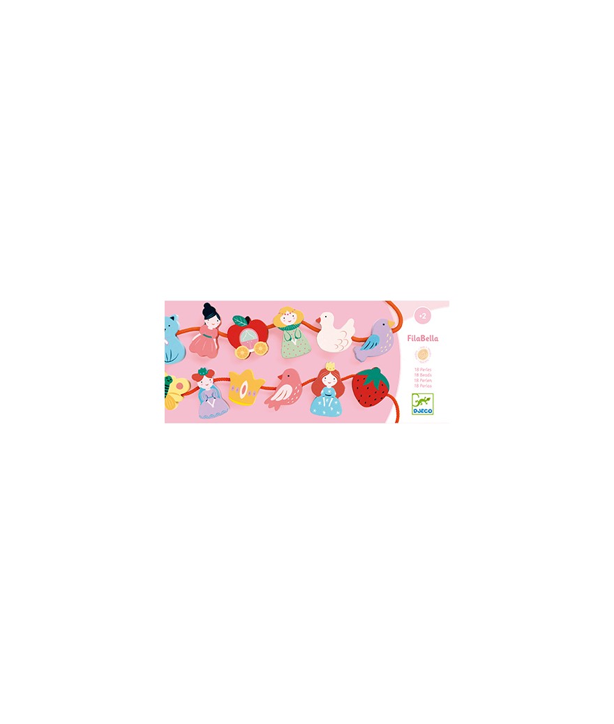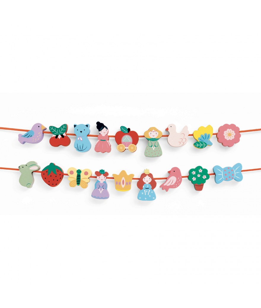 Prachtig geïllustreerde houten kralen met het thema prinsessen. Het kind rijgt met plezier de kralen aan de 2 touwtjes en laat zijn fantasie de vrije loop. Ideaal vanaf de leeftijd van 2 jaar voor het eerste leerproces van het kind.