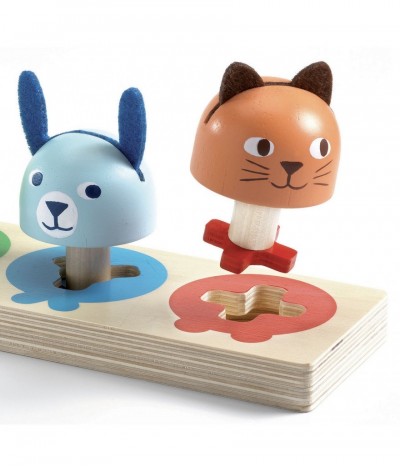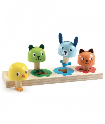 4 gekleurde dieren om in de grondplaat te plaatsen volgens de vorm van hun voeten. Het kind observeert de vorm van de voet om hem op de juiste plaats te zetten en draait het hoofd om het gezicht voor zich te zien.