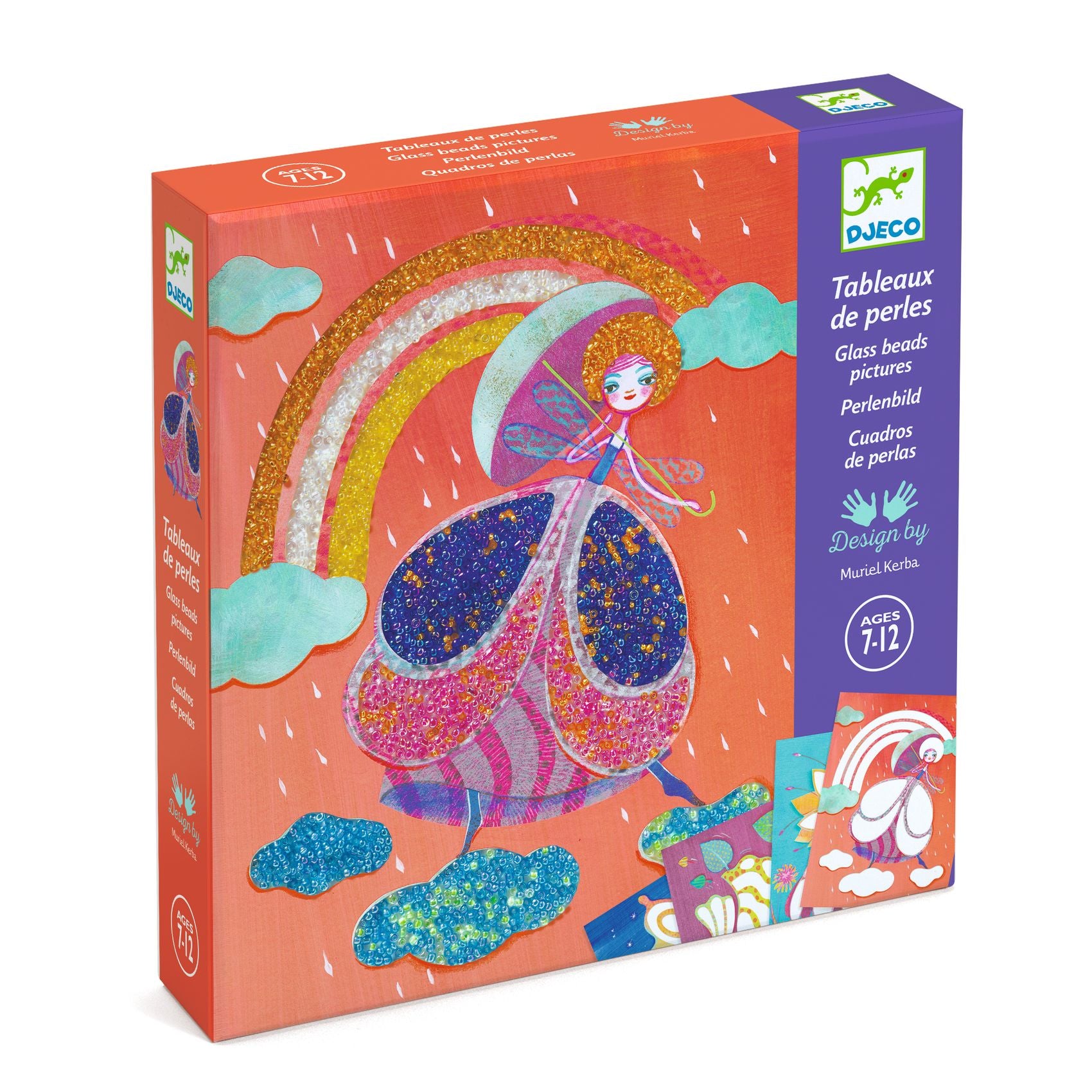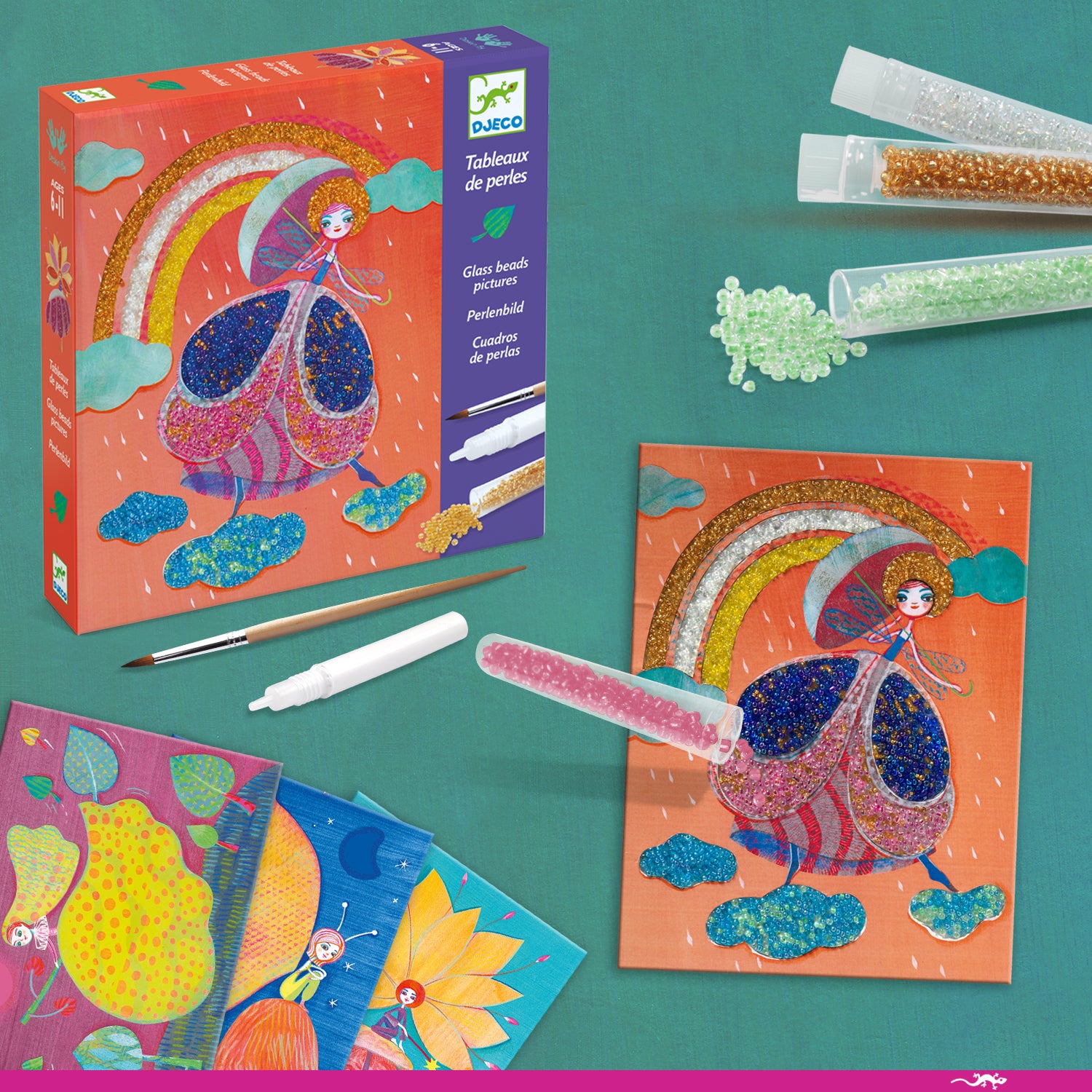 Inhoud: 4 kleurplaten (15 x 20 cm), 16 tubes met kralen, 3 tubes lijm, 1 penseel, 4 houten stokjes, 3 plastic bakjes, 1 klein plastic bordje, 1 stap-voor-stap instructieboekje in kleur.