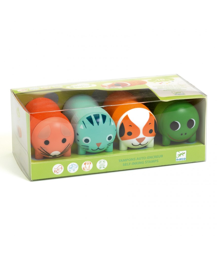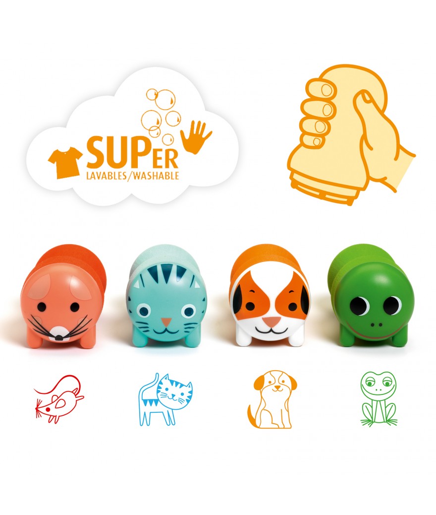 4 ergonomische en zelfbevochtigende stempels ontworpen door Djeco. Een schuimrubberen handvat speciaal voor kleine handen en zelfbevochtigende stempels die goed markeren.