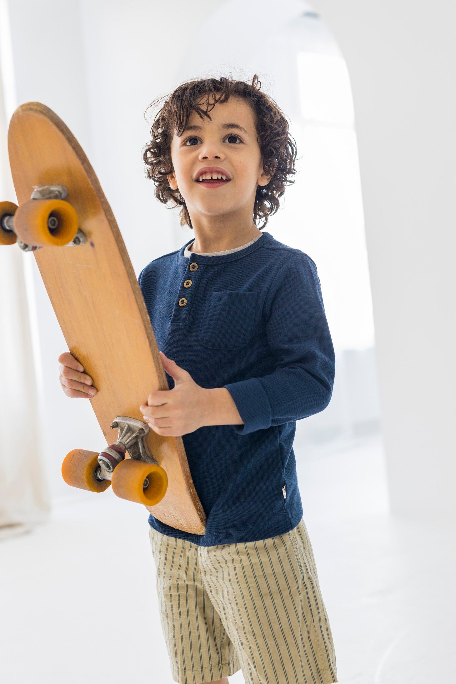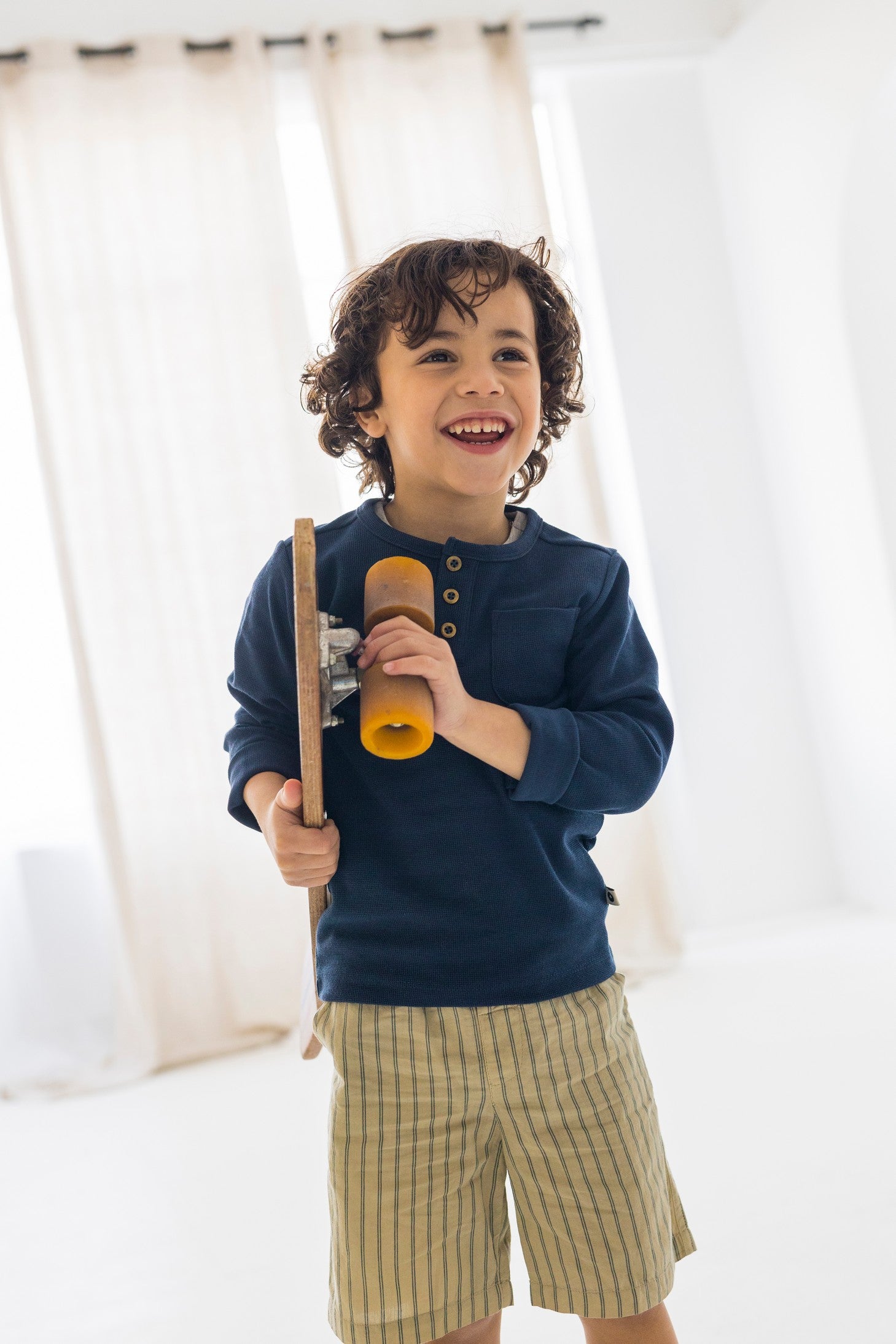 Like Flo geweven short van een lekkere katoenen stof met sportief blauw streepje en mud overdye. Een heerlijk zomers shortje, kom maar op met die zomer.