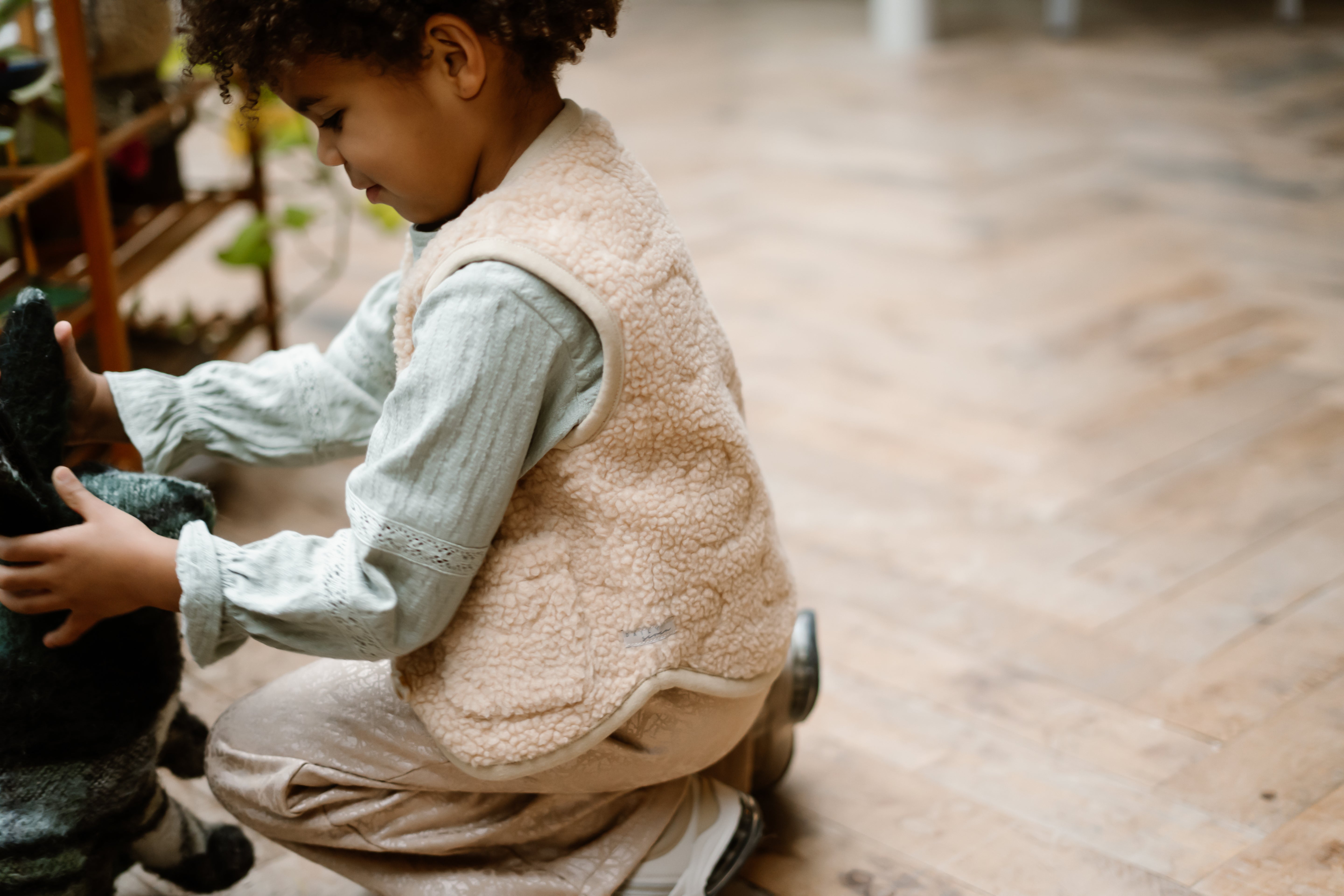 Gemaakt van 100% polyester en uitgevoerd in een rustige, lichte zandtint, is dit gilet eenvoudig te combineren met sweaters, jurkjes of longsleeves. De mouwloze snit zorgt voor bewegingsvrijheid, terwijl de teddy kwaliteit warmte en comfort biedt. Ideaal voor binnen én buiten.