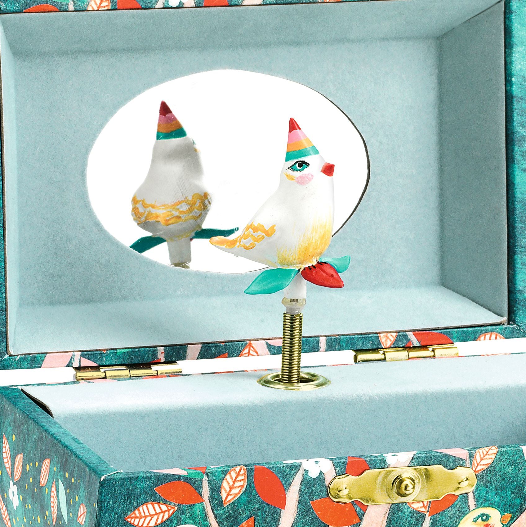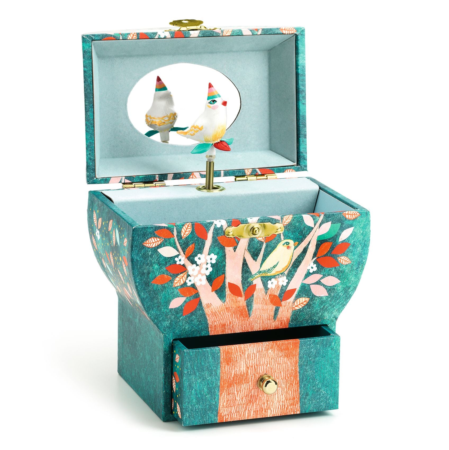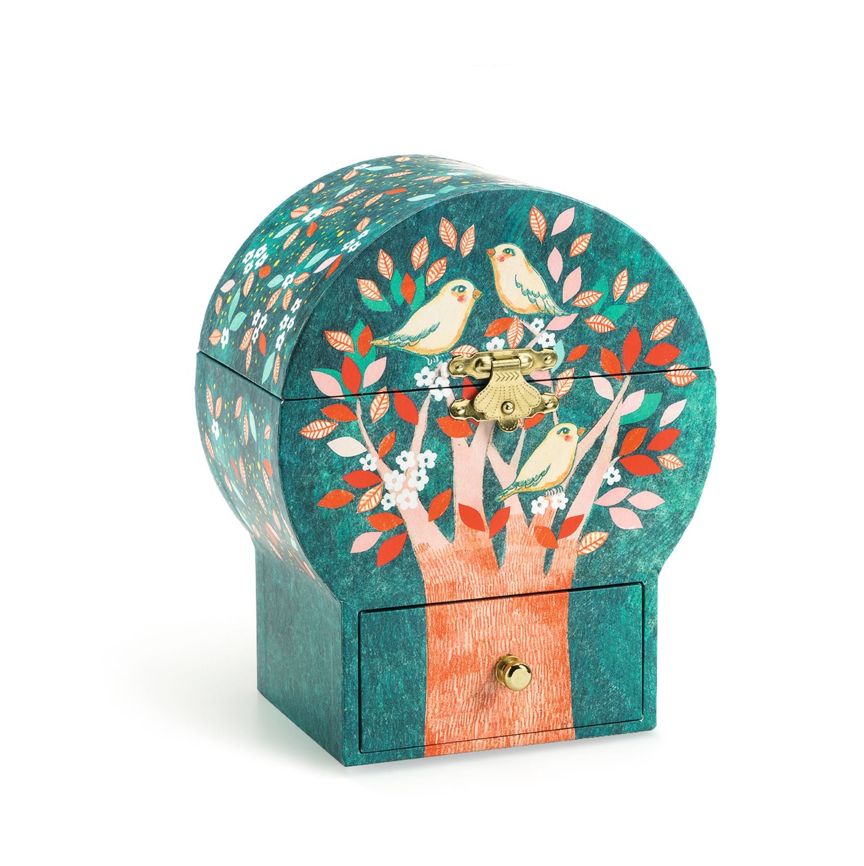 De poëtische boom is een prachtig geïllustreerd speeldoosje met silhouetten en een lade voor het bewaren van juwelen en geheimen. Draai de sleutel om, open de doos en alles komt tot leven! Een mooie, mooi gebeeldhouwde figuur draait zich om en wordt weerspiegeld in een ovalen spiegel op de muziek van Johann Strauss' "Santa Lucia".