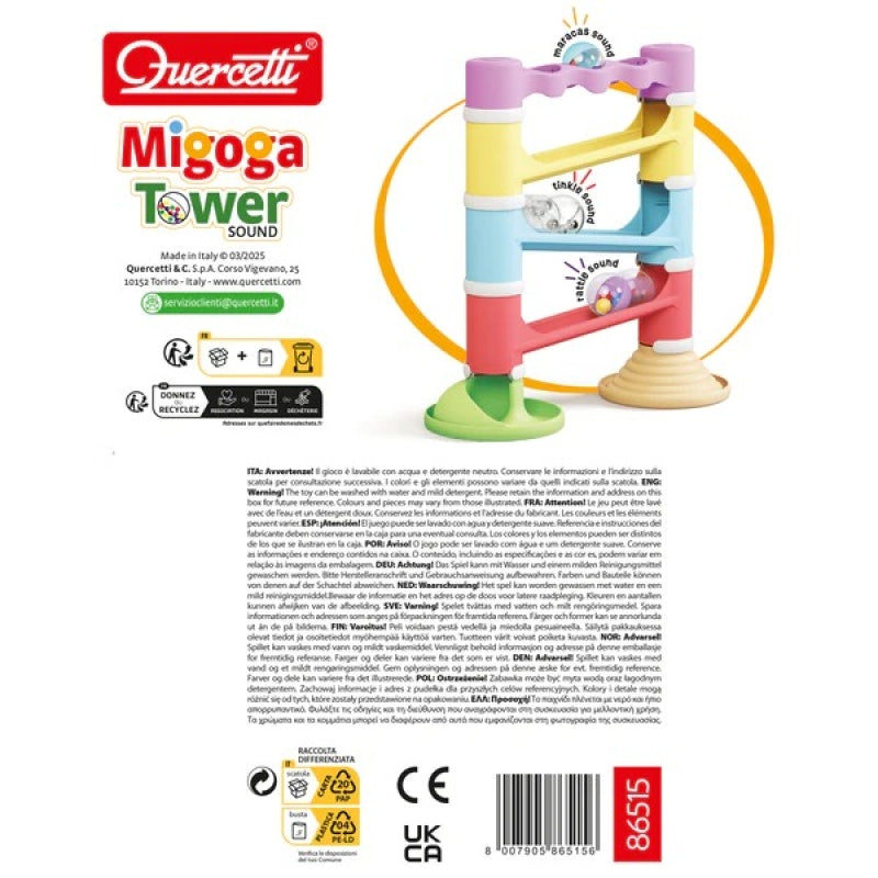 De baan maakt deel uit van de Play Eco+-lijn en bevat 3 grote geluidballen die rammelen terwijl ze van de toren rollen, wat zorgt voor een speelse sensorische ervaring.