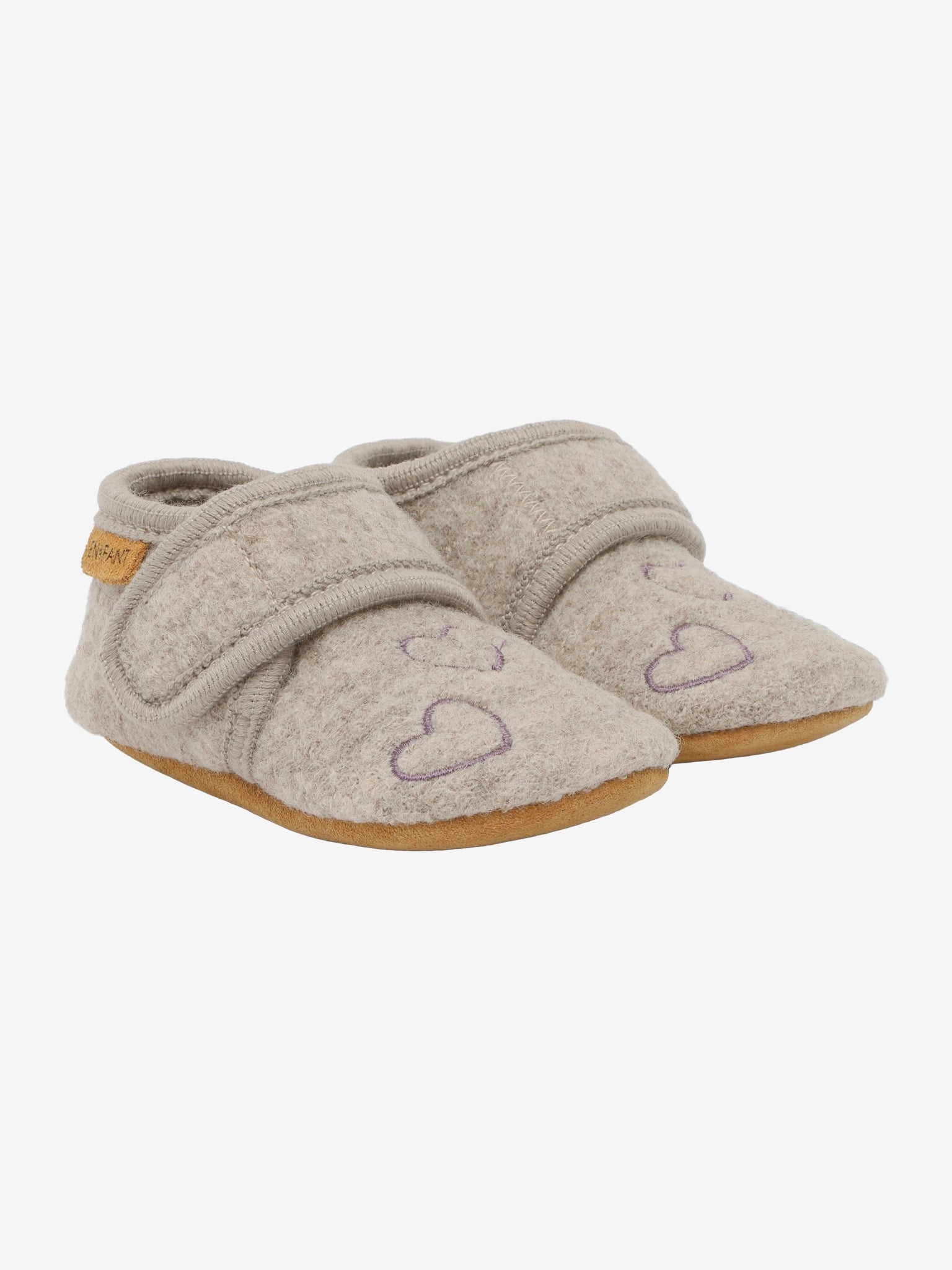 Schattige wollen pantoffels met embroidery. De pantoffels sluiten met klittenband aan de bovenkant. Ze hebben een suède zool en een suède vlaglabel op beide pantoffels.