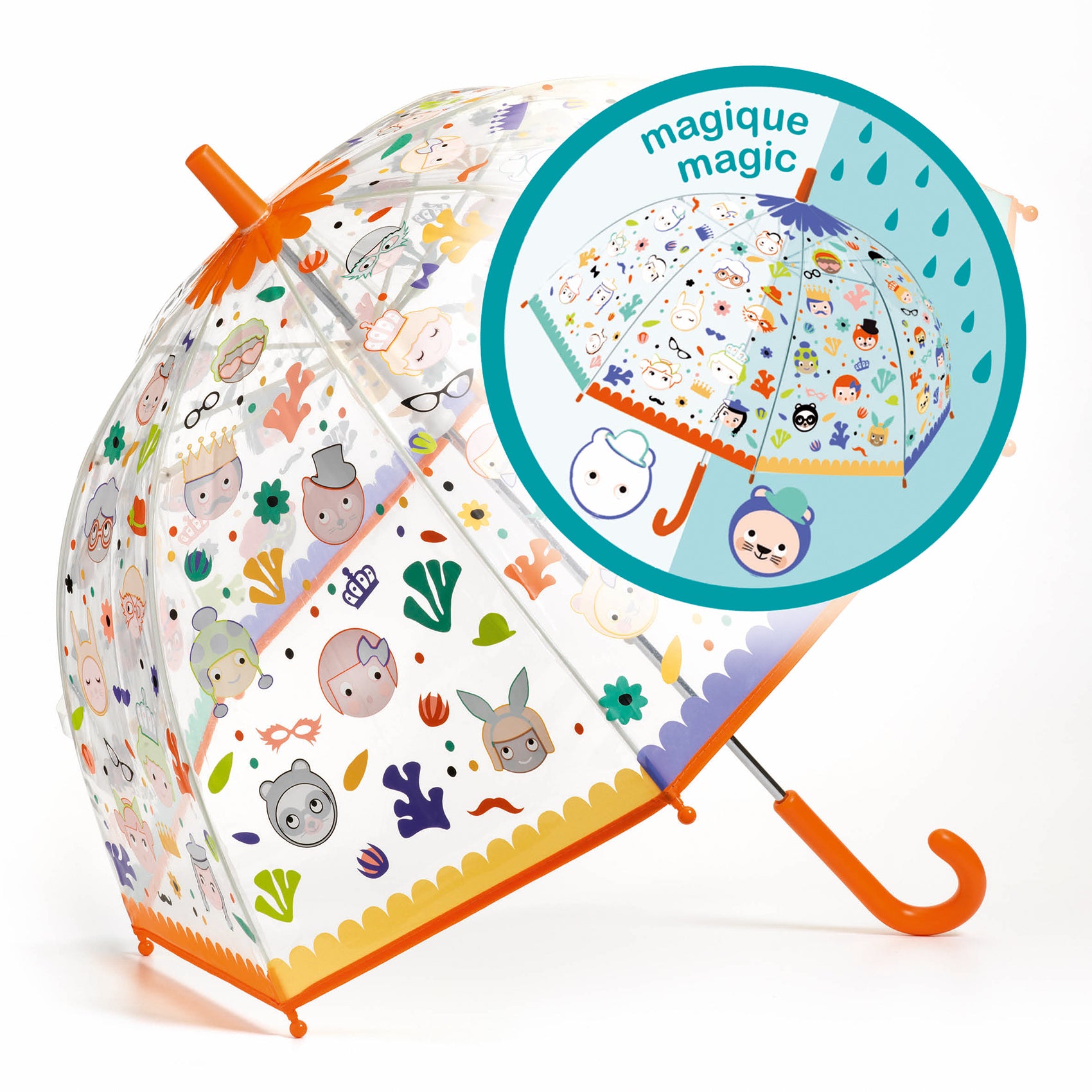 Een chique en praktische paraplu geïllustreerd met gezichten die verschijnen bij contact met water en verdwijnen zodra de paraplu droog is. Dankzij de doorzichtigheid kan je kind zien waar het loopt en dankzij de handmatige opening met beveiligingssysteem kan het worden geopend en gesloten zonder de vingers af te knellen. Een kleurrijk accessoire, ideaal om uitstapjes in de regen op te vrolijken!